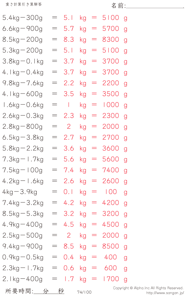 上記のボタンから「kg・gの引き算」の算数数学ドリル・計算ドリル(PDFプリント)がダウンロードできます。個人利用は無料です(家庭以外での配布は有料です)。