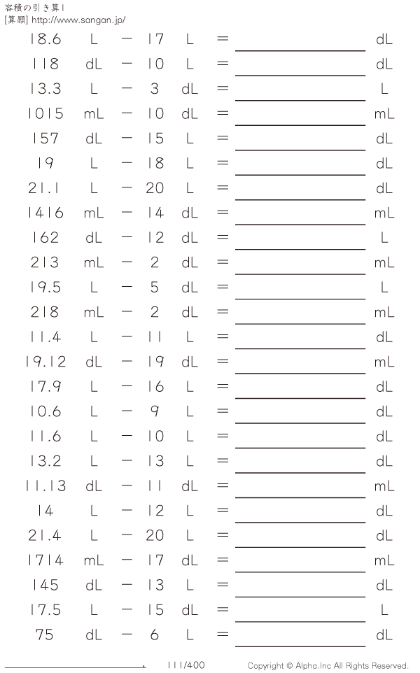 上記のボタンから「容積の引き算」の算数数学ドリル・計算ドリル(PDFプリント)がダウンロードできます。個人利用は無料です(家庭以外での配布は有料です)。