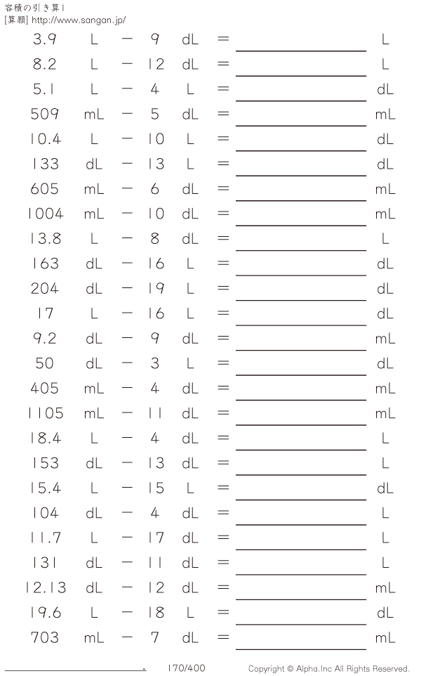 上記のボタンから「容積の引き算」の算数数学ドリル・計算ドリル(PDFプリント)がダウンロードできます。個人利用は無料です(家庭以外での配布は有料です)。