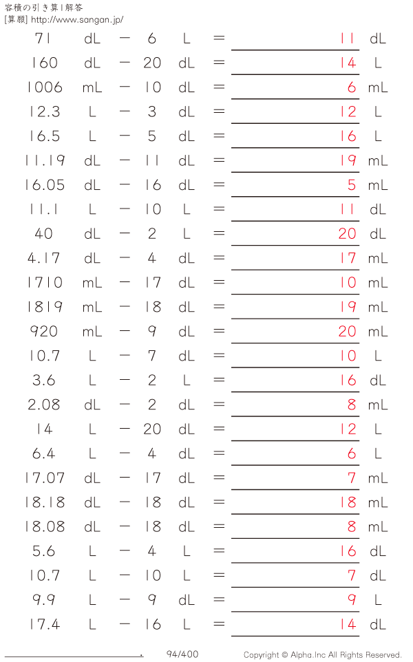 上記のボタンから「容積の引き算」の算数数学ドリル・計算ドリル(PDFプリント)がダウンロードできます。個人利用は無料です(家庭以外での配布は有料です)。