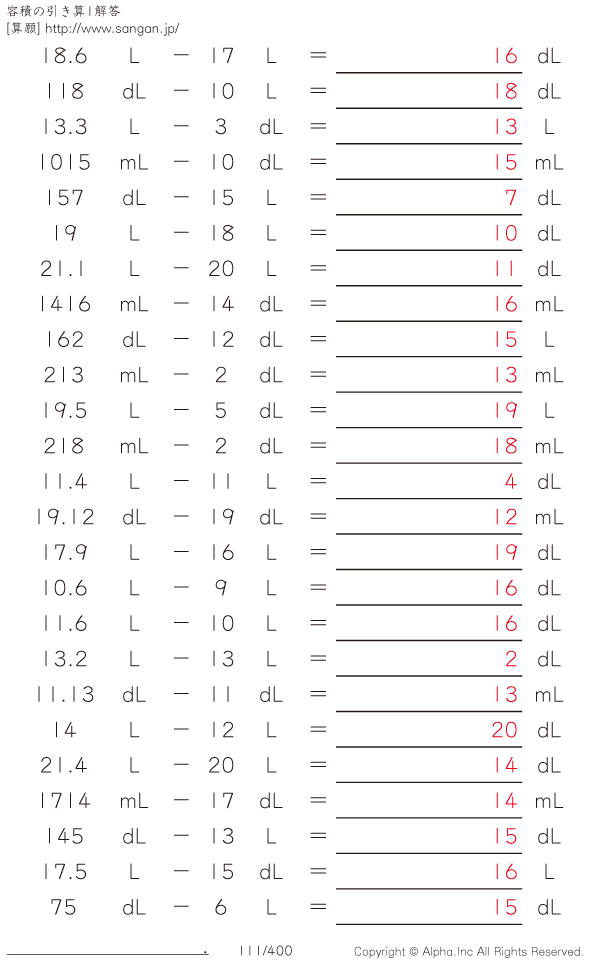 上記のボタンから「容積の引き算」の算数数学ドリル・計算ドリル(PDFプリント)がダウンロードできます。個人利用は無料です(家庭以外での配布は有料です)。