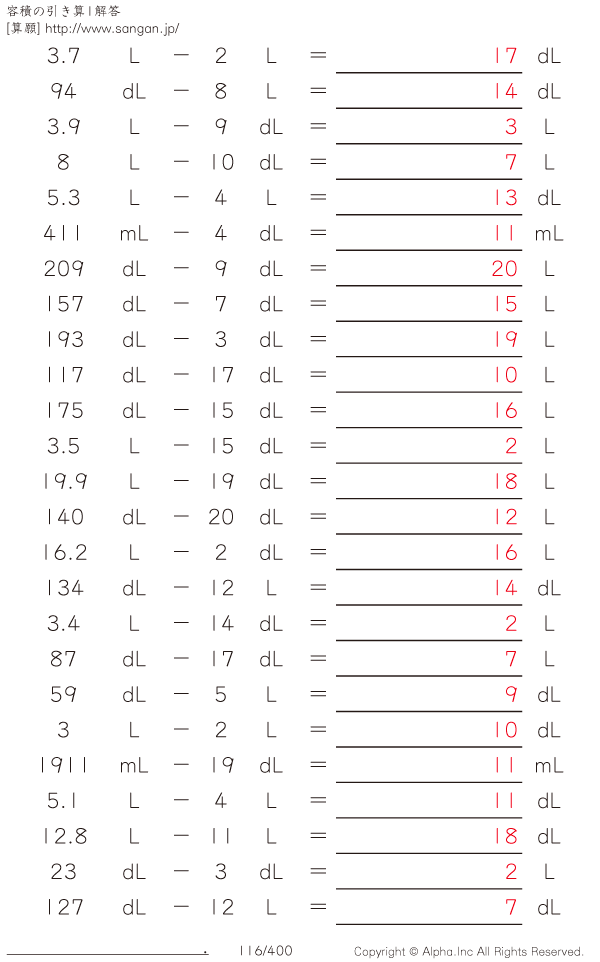 上記のボタンから「容積の引き算」の算数数学ドリル・計算ドリル(PDFプリント)がダウンロードできます。個人利用は無料です(家庭以外での配布は有料です)。
