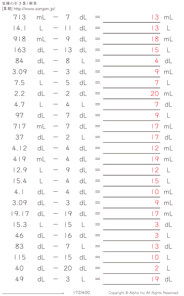 上記のボタンから「容積の引き算」の算数数学ドリル・計算ドリル(PDFプリント)がダウンロードできます。個人利用は無料です(家庭以外での配布は有料です)。
