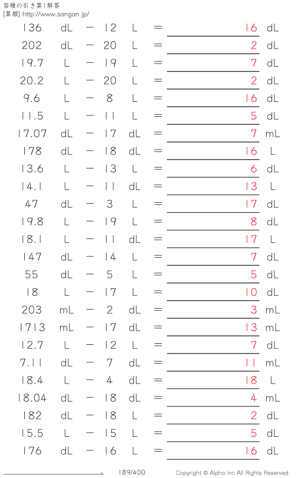 上記のボタンから「容積の引き算」の算数数学ドリル・計算ドリル(PDFプリント)がダウンロードできます。個人利用は無料です(家庭以外での配布は有料です)。
