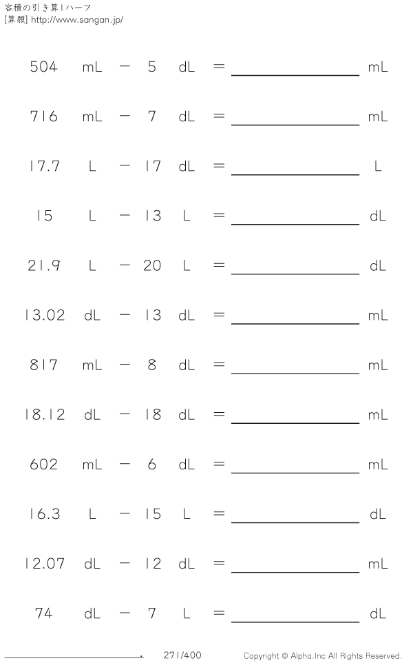 上記のボタンから「容積の引き算(ハーフ)」の算数数学ドリル・計算ドリル(PDFプリント)がダウンロードできます。個人利用は無料です(家庭以外での配布は有料です)。