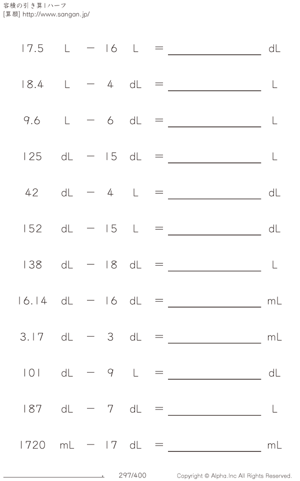 上記のボタンから「容積の引き算(ハーフ)」の算数数学ドリル・計算ドリル(PDFプリント)がダウンロードできます。個人利用は無料です(家庭以外での配布は有料です)。