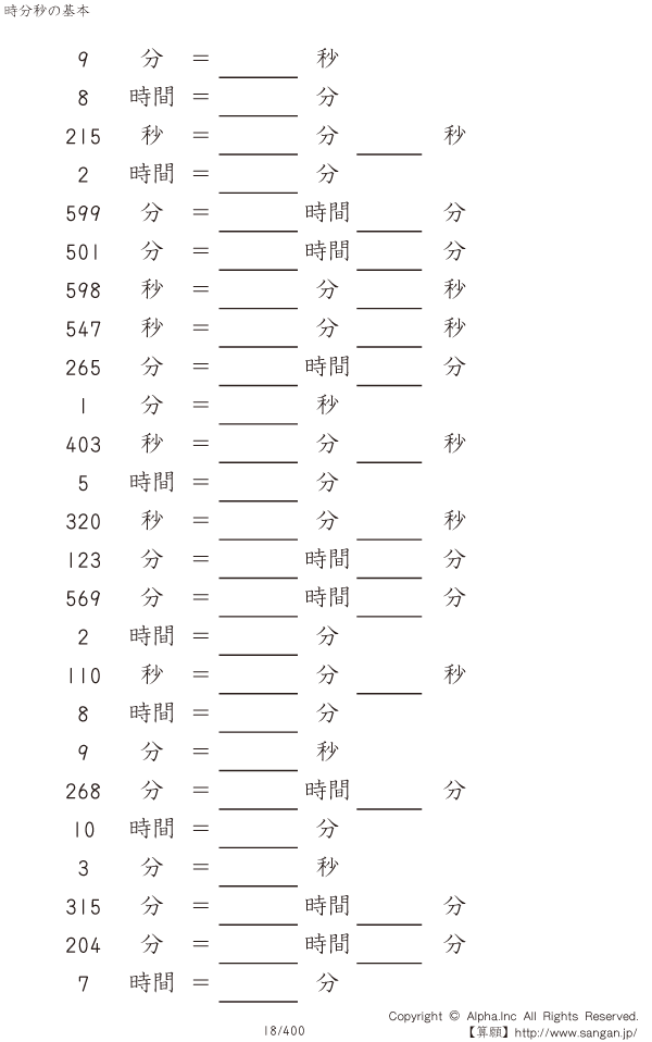 上記のボタンから「時分秒の基本」の算数数学ドリル・計算ドリル(PDFプリント)がダウンロードできます。個人利用は無料です(家庭以外での配布は有料です)。