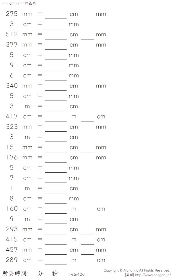 上記のボタンから「m・cm・mm」の算数数学ドリル・計算ドリル(PDFプリント)がダウンロードできます。個人利用は無料です(家庭以外での配布は有料です)。