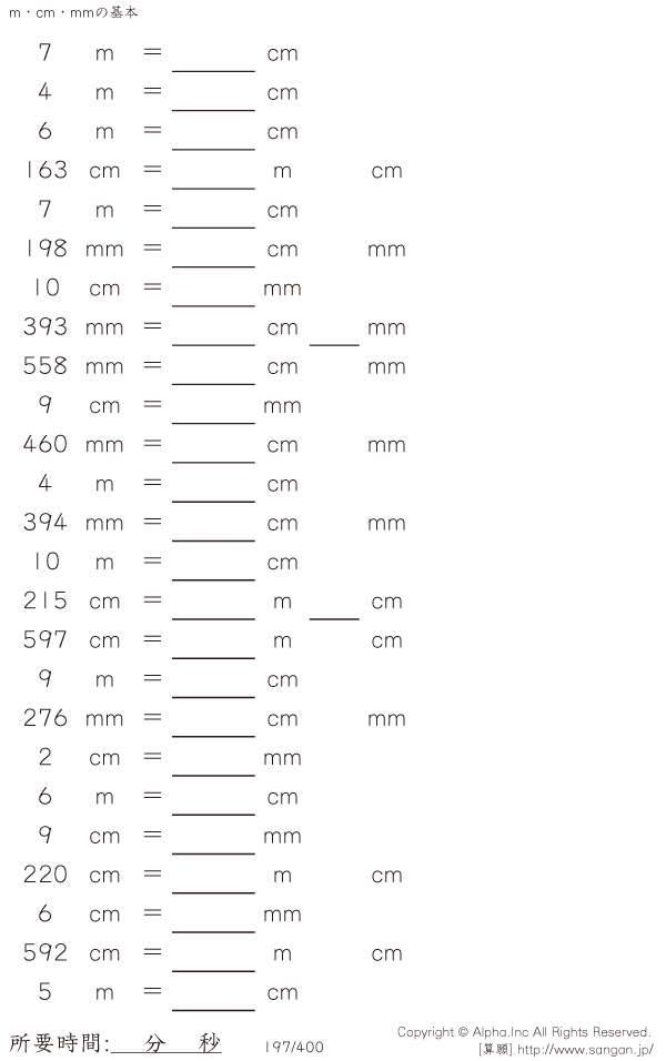 上記のボタンから「m・cm・mm」の算数数学ドリル・計算ドリル(PDFプリント)がダウンロードできます。個人利用は無料です(家庭以外での配布は有料です)。