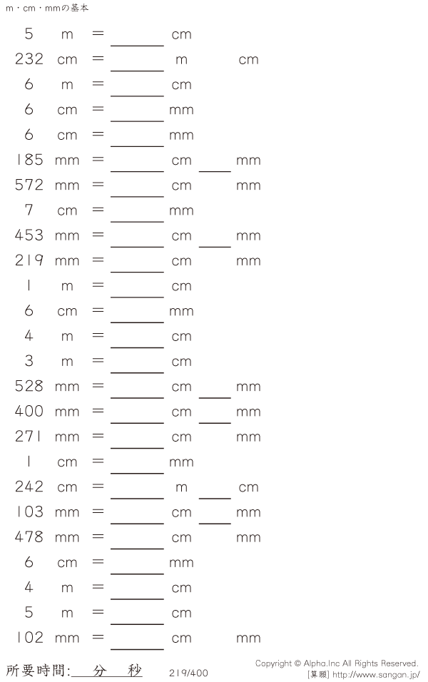 上記のボタンから「m・cm・mm」の算数数学ドリル・計算ドリル(PDFプリント)がダウンロードできます。個人利用は無料です(家庭以外での配布は有料です)。