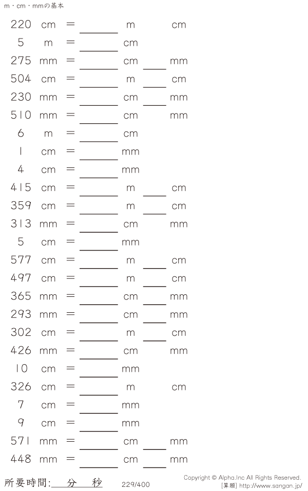 上記のボタンから「m・cm・mm」の算数数学ドリル・計算ドリル(PDFプリント)がダウンロードできます。個人利用は無料です(家庭以外での配布は有料です)。