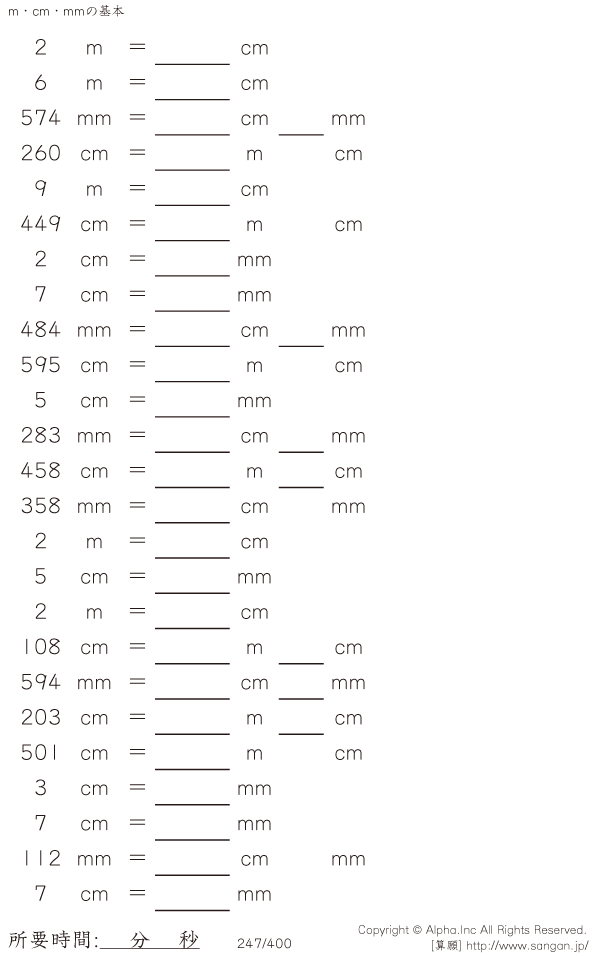上記のボタンから「m・cm・mm」の算数数学ドリル・計算ドリル(PDFプリント)がダウンロードできます。個人利用は無料です(家庭以外での配布は有料です)。