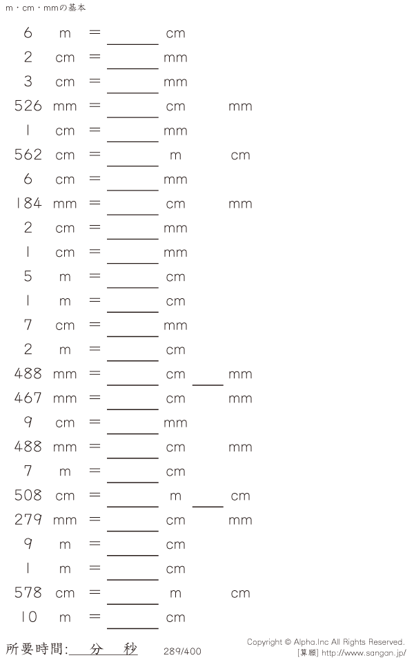 上記のボタンから「m・cm・mm」の算数数学ドリル・計算ドリル(PDFプリント)がダウンロードできます。個人利用は無料です(家庭以外での配布は有料です)。