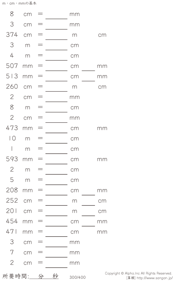 上記のボタンから「m・cm・mm」の算数数学ドリル・計算ドリル(PDFプリント)がダウンロードできます。個人利用は無料です(家庭以外での配布は有料です)。