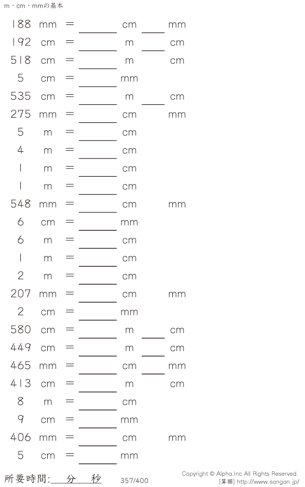 上記のボタンから「m・cm・mm」の算数数学ドリル・計算ドリル(PDFプリント)がダウンロードできます。個人利用は無料です(家庭以外での配布は有料です)。