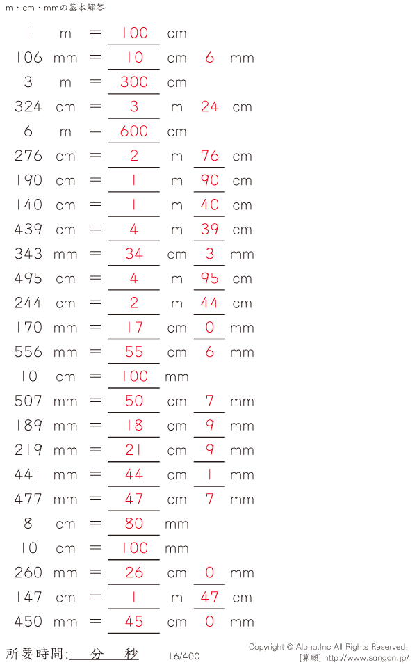 上記のボタンから「m・cm・mm」の算数数学ドリル・計算ドリル(PDFプリント)がダウンロードできます。個人利用は無料です(家庭以外での配布は有料です)。
