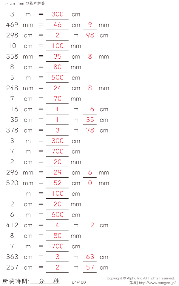 上記のボタンから「m・cm・mm」の算数数学ドリル・計算ドリル(PDFプリント)がダウンロードできます。個人利用は無料です(家庭以外での配布は有料です)。