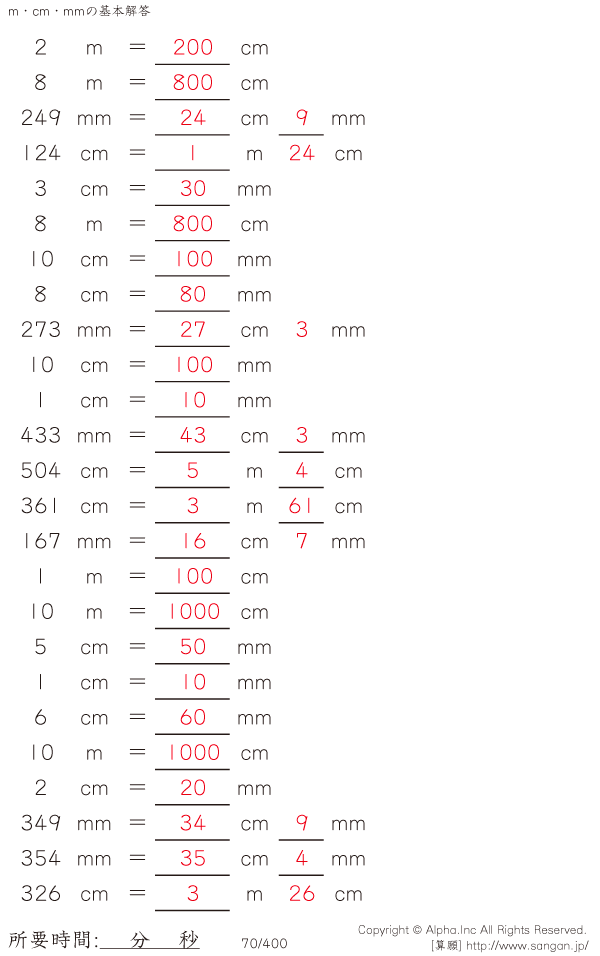 上記のボタンから「m・cm・mm」の算数数学ドリル・計算ドリル(PDFプリント)がダウンロードできます。個人利用は無料です(家庭以外での配布は有料です)。