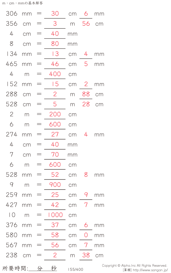 上記のボタンから「m・cm・mm」の算数数学ドリル・計算ドリル(PDFプリント)がダウンロードできます。個人利用は無料です(家庭以外での配布は有料です)。