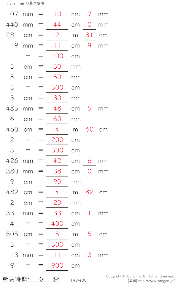 上記のボタンから「m・cm・mm」の算数数学ドリル・計算ドリル(PDFプリント)がダウンロードできます。個人利用は無料です(家庭以外での配布は有料です)。