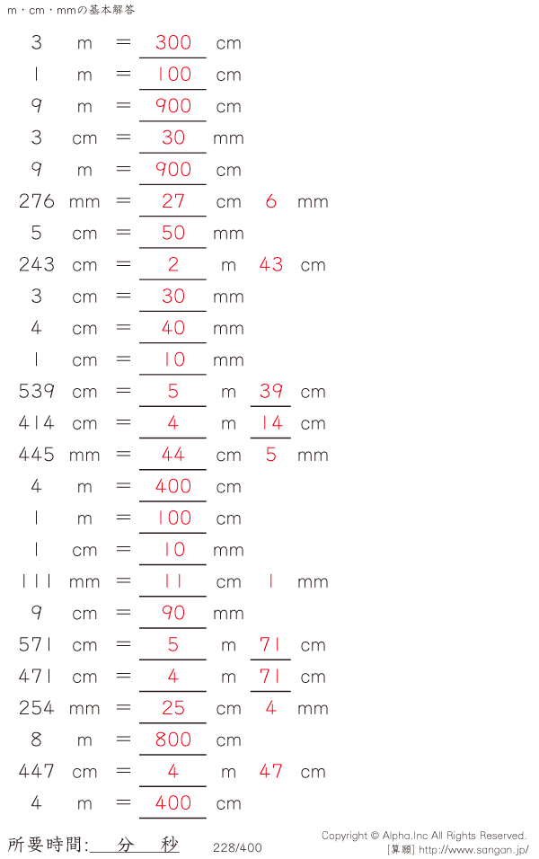 上記のボタンから「m・cm・mm」の算数数学ドリル・計算ドリル(PDFプリント)がダウンロードできます。個人利用は無料です(家庭以外での配布は有料です)。
