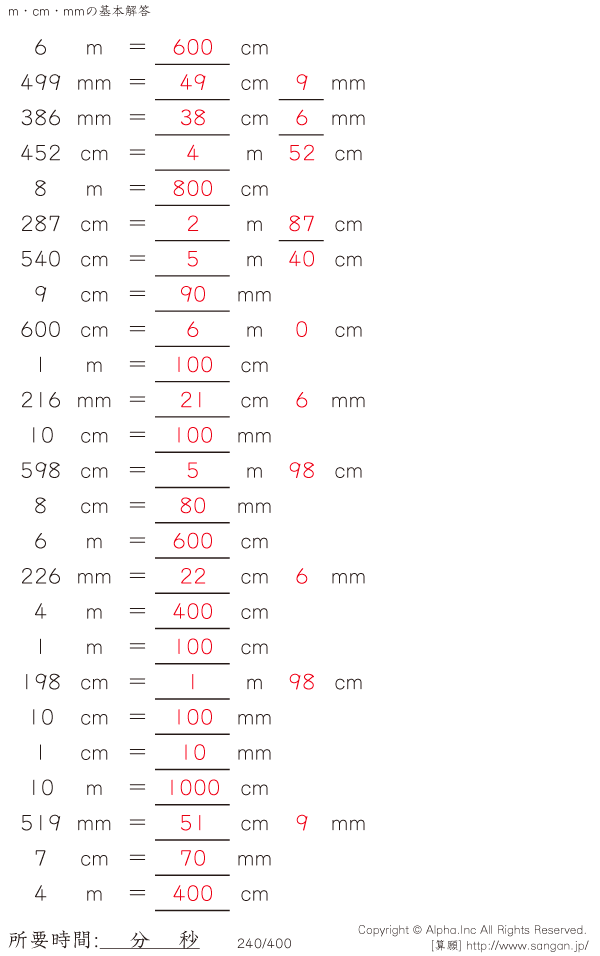 上記のボタンから「m・cm・mm」の算数数学ドリル・計算ドリル(PDFプリント)がダウンロードできます。個人利用は無料です(家庭以外での配布は有料です)。