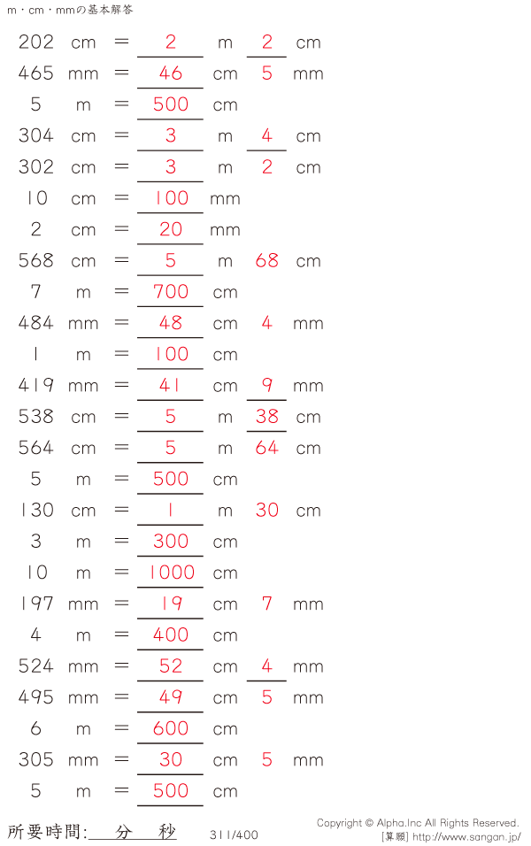 上記のボタンから「m・cm・mm」の算数数学ドリル・計算ドリル(PDFプリント)がダウンロードできます。個人利用は無料です(家庭以外での配布は有料です)。