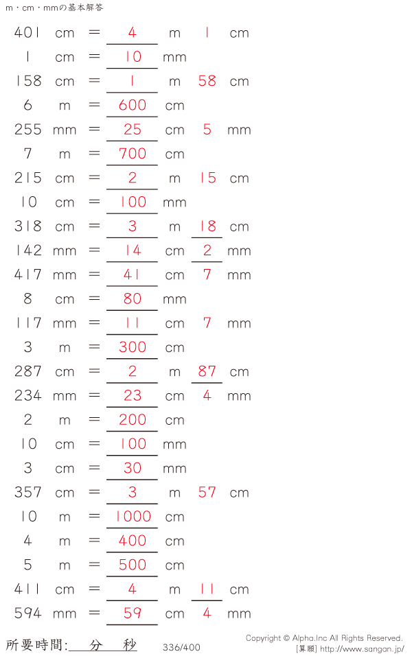 上記のボタンから「m・cm・mm」の算数数学ドリル・計算ドリル(PDFプリント)がダウンロードできます。個人利用は無料です(家庭以外での配布は有料です)。