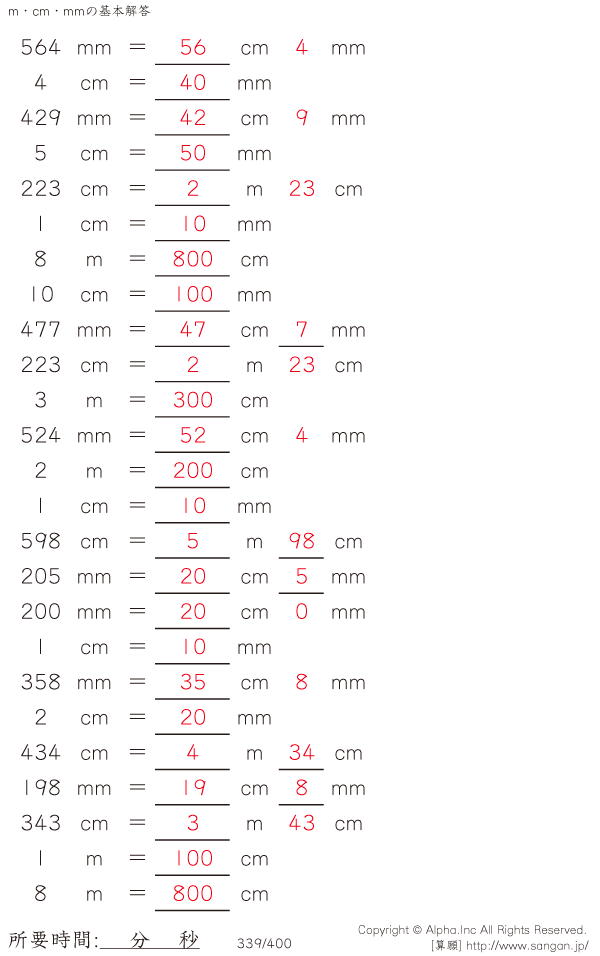 上記のボタンから「m・cm・mm」の算数数学ドリル・計算ドリル(PDFプリント)がダウンロードできます。個人利用は無料です(家庭以外での配布は有料です)。