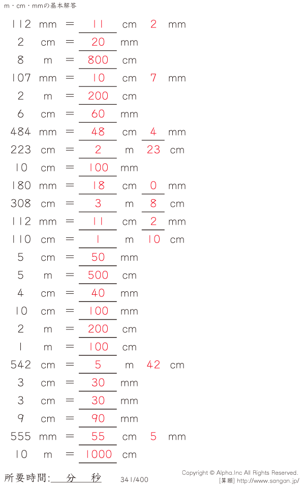 上記のボタンから「m・cm・mm」の算数数学ドリル・計算ドリル(PDFプリント)がダウンロードできます。個人利用は無料です(家庭以外での配布は有料です)。