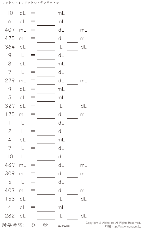 上記のボタンから「リットル・デシリットル・ミリリットル」の算数数学ドリル・計算ドリル(PDFプリント)がダウンロードできます。個人利用は無料です(家庭以外での配布は有料です)。
