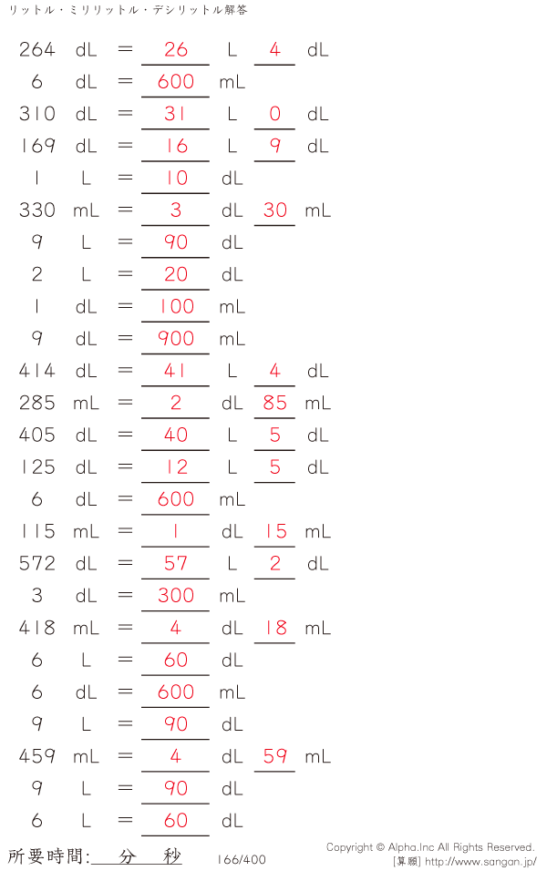上記のボタンから「リットル・デシリットル・ミリリットル」の算数数学ドリル・計算ドリル(PDFプリント)がダウンロードできます。個人利用は無料です(家庭以外での配布は有料です)。