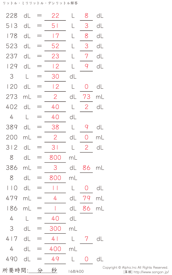上記のボタンから「リットル・デシリットル・ミリリットル」の算数数学ドリル・計算ドリル(PDFプリント)がダウンロードできます。個人利用は無料です(家庭以外での配布は有料です)。