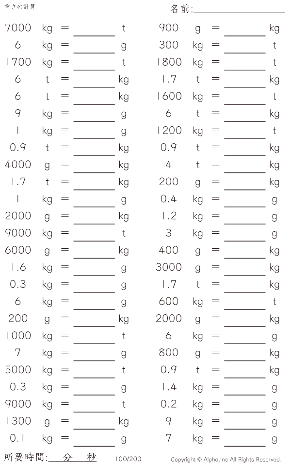 上記のボタンから「グラム・キロ・トン」の算数数学ドリル・計算ドリル(PDFプリント)がダウンロードできます。個人利用は無料です(家庭以外での配布は有料です)。
