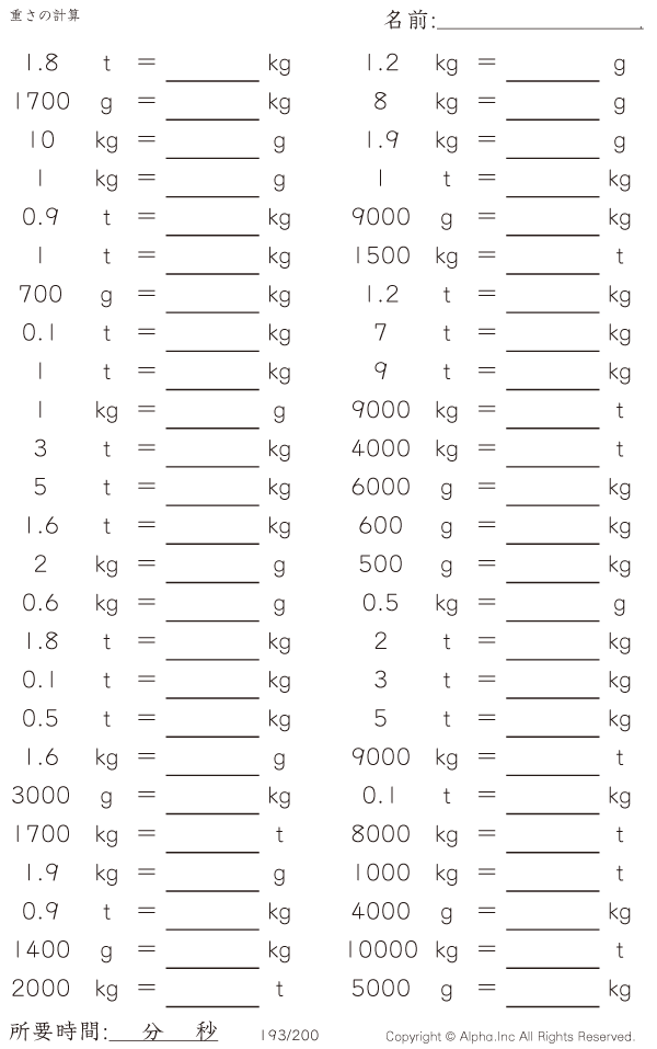 上記のボタンから「グラム・キロ・トン」の算数数学ドリル・計算ドリル(PDFプリント)がダウンロードできます。個人利用は無料です(家庭以外での配布は有料です)。