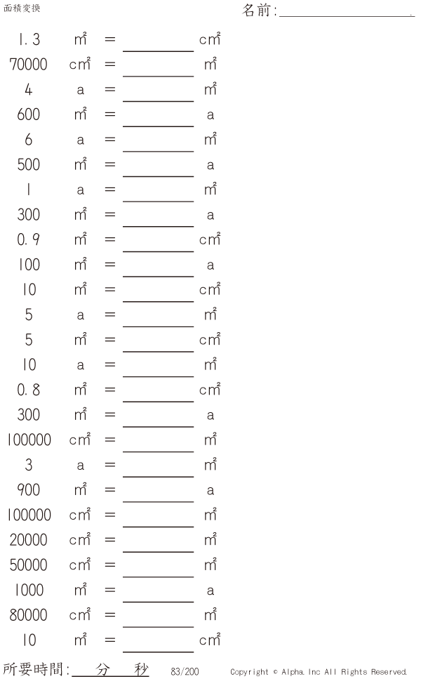 上記のボタンから「面積変換」の算数数学ドリル・計算ドリル(PDFプリント)がダウンロードできます。個人利用は無料です(家庭以外での配布は有料です)。