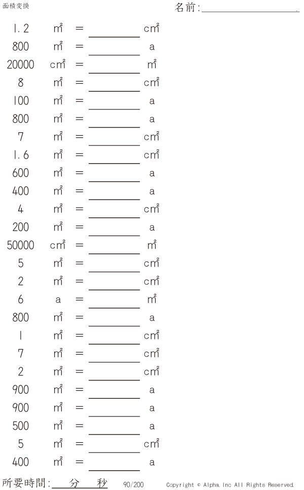 上記のボタンから「面積変換」の算数数学ドリル・計算ドリル(PDFプリント)がダウンロードできます。個人利用は無料です(家庭以外での配布は有料です)。