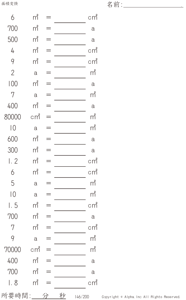 上記のボタンから「面積変換」の算数数学ドリル・計算ドリル(PDFプリント)がダウンロードできます。個人利用は無料です(家庭以外での配布は有料です)。