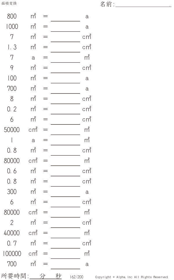 上記のボタンから「面積変換」の算数数学ドリル・計算ドリル(PDFプリント)がダウンロードできます。個人利用は無料です(家庭以外での配布は有料です)。