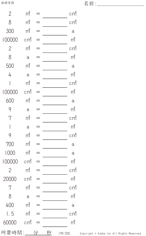 上記のボタンから「面積変換」の算数数学ドリル・計算ドリル(PDFプリント)がダウンロードできます。個人利用は無料です(家庭以外での配布は有料です)。