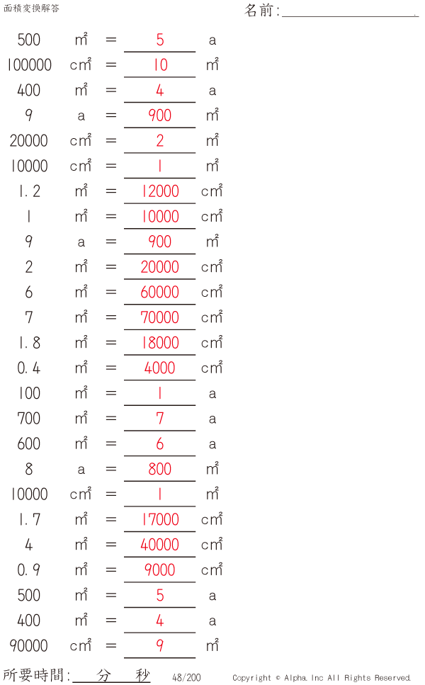 上記のボタンから「面積変換」の算数数学ドリル・計算ドリル(PDFプリント)がダウンロードできます。個人利用は無料です(家庭以外での配布は有料です)。