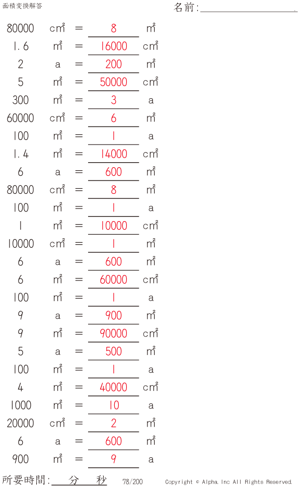 上記のボタンから「面積変換」の算数数学ドリル・計算ドリル(PDFプリント)がダウンロードできます。個人利用は無料です(家庭以外での配布は有料です)。
