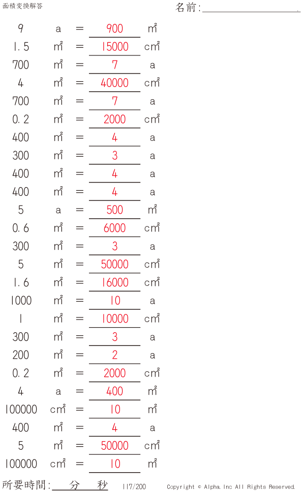 上記のボタンから「面積変換」の算数数学ドリル・計算ドリル(PDFプリント)がダウンロードできます。個人利用は無料です(家庭以外での配布は有料です)。