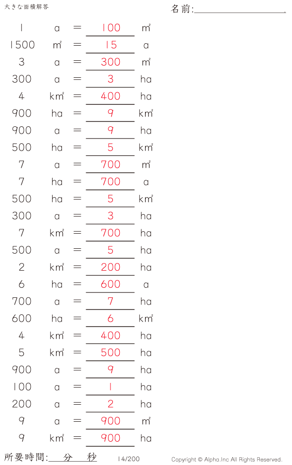上記のボタンから「大きな面積・アール・ヘクタール」の算数数学ドリル・計算ドリル(PDFプリント)がダウンロードできます。個人利用は無料です(家庭以外での配布は有料です)。