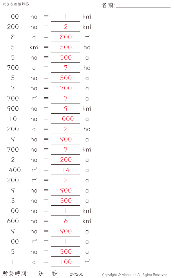 上記のボタンから「大きな面積・アール・ヘクタール」の算数数学ドリル・計算ドリル(PDFプリント)がダウンロードできます。個人利用は無料です(家庭以外での配布は有料です)。