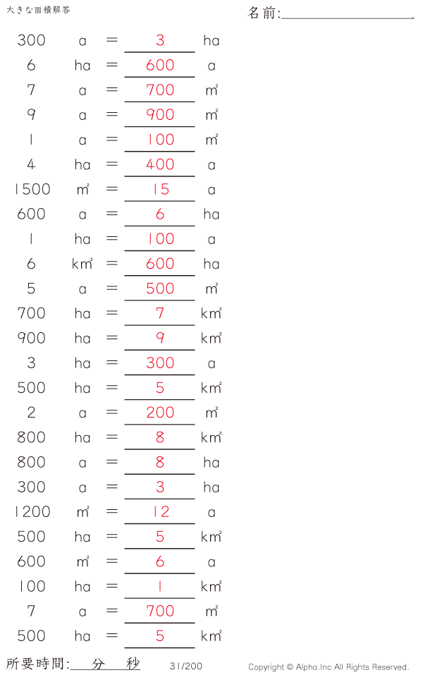 上記のボタンから「大きな面積・アール・ヘクタール」の算数数学ドリル・計算ドリル(PDFプリント)がダウンロードできます。個人利用は無料です(家庭以外での配布は有料です)。