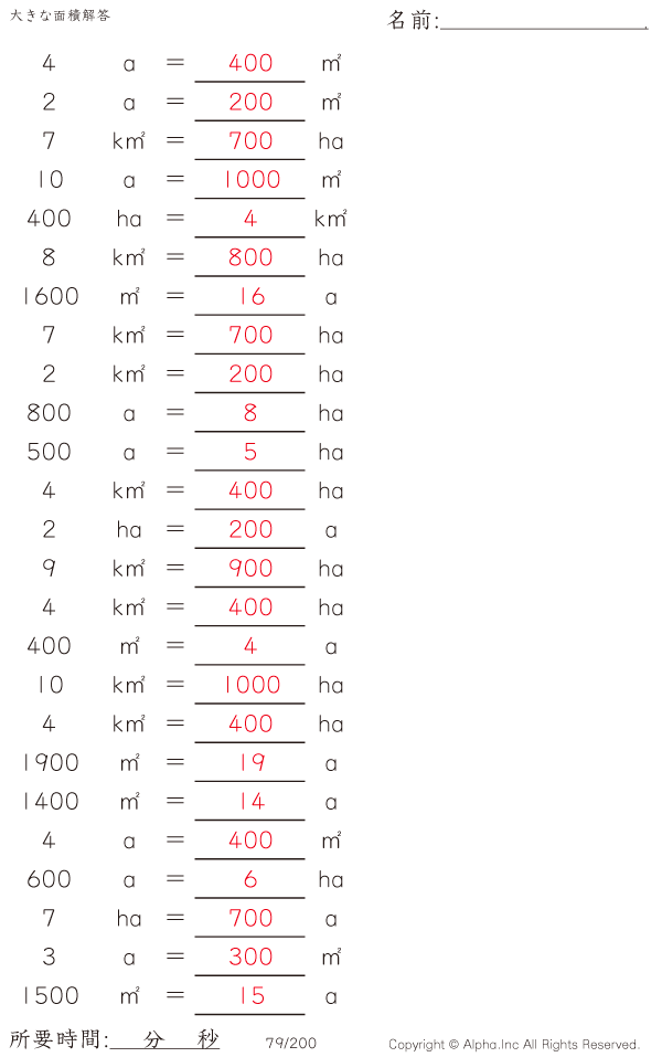 上記のボタンから「大きな面積・アール・ヘクタール」の算数数学ドリル・計算ドリル(PDFプリント)がダウンロードできます。個人利用は無料です(家庭以外での配布は有料です)。
