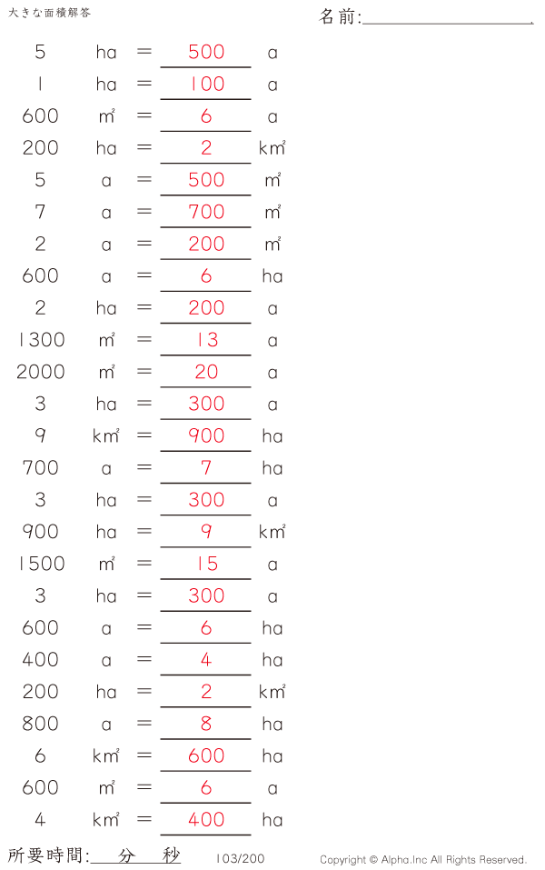 上記のボタンから「大きな面積・アール・ヘクタール」の算数数学ドリル・計算ドリル(PDFプリント)がダウンロードできます。個人利用は無料です(家庭以外での配布は有料です)。