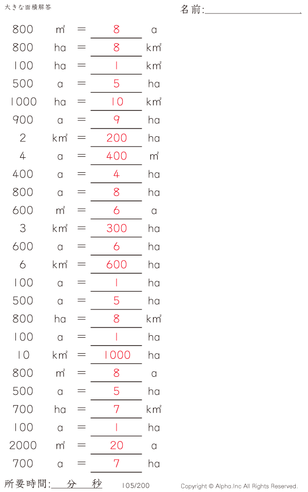 上記のボタンから「大きな面積・アール・ヘクタール」の算数数学ドリル・計算ドリル(PDFプリント)がダウンロードできます。個人利用は無料です(家庭以外での配布は有料です)。