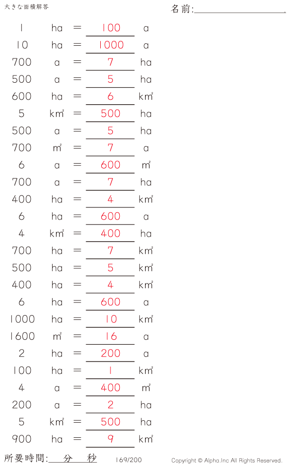 上記のボタンから「大きな面積・アール・ヘクタール」の算数数学ドリル・計算ドリル(PDFプリント)がダウンロードできます。個人利用は無料です(家庭以外での配布は有料です)。